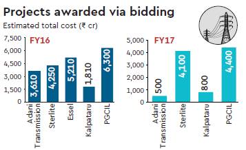 Companies who have been awarded such projects till date include Adani Power, Essel Infraprojects, Sterlite Power, Kalpataru Power Transmission, Larsen & Toubro, Reliance Power and Power Grid Corporation of India Ltd (PGCIL) – the central transmission utility. The two projects awarded to Reliance in FY10, worth around Rs 4,100 crore as per industry estimates, are yet to be implemented. State-backed transmission behemoth PGCIL has won ten projects, worth around Rs 18,000 crore, under the bidding route. One of the PGCIL projects was scrapped by the Central Electricity Regulatory Commission in April 2015.