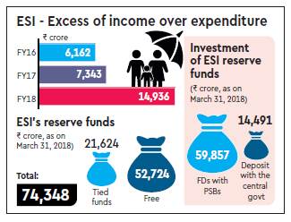 With its income far exceeding expenses, the Employees State Insurance Corporation (ESIC) has over the years accumulated huge amounts as reserve funds — at the end of FY18, this was a staggering `74,348 crore, 70% of which not earmarked for any purpose and therefore, free.
