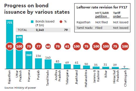 The onboarding of 26 states and one Union Territory is in stark contrast to just 10 states having joined the scheme in the same period last year. As of April 14, 2017, around 16 States had issued `2.32 lakh crore worth of bonds, which was 85.39% of the planned issuances of `2.72 lakh crore. The AT&C losses have come down to an average of 22.59%,while the gap between the average cost of supply and revenue realised has been reduced by 12 paise to 50 paise per kwh through cost realisation programmes, and tariff hikes.