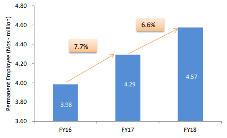 The study of employment growth in 700 companies also showed that overall job growth has declined in FY18 as compared with previous fiscal even as there was robust sales growth in some cases. The total permanent employees in the sample of these 700 companies increased from 3.98 million in FY16 to 4.29 million in FY17, further increasing by 6.6% in FY18 to touch 4.57 million.