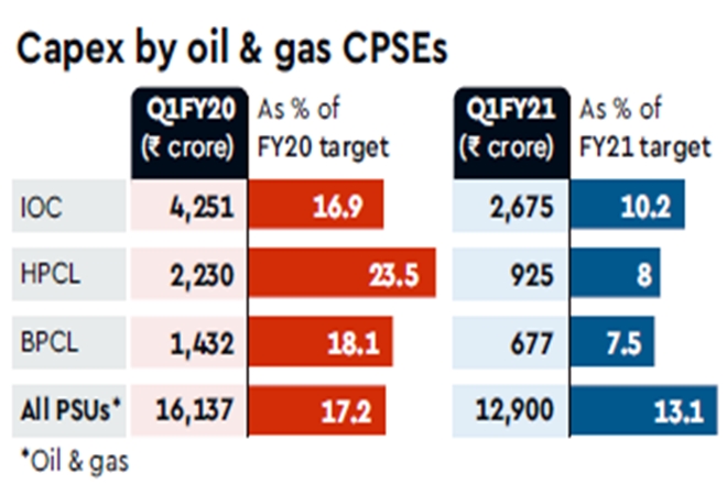 In Q1FY21, petroleum CPSEs together achieved capex of Rs 12,900 crore, against their annual target of Rs 98,522 crore. Their capital spending in the year ago quarter was higher at Rs 16,137 crore, against an annual target of Rs 93,639 crore (see chart).