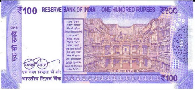 The new Rs 100 notes, soon to be issued, has a Motif of “RANI KI VAV” on the back side, depicting the country’s cultural heritage. RANI KI VAV is a memorial built in Patan, Gujarat for the 11th-century king Bhima. The new notes are Lavender-coloured and have 16 silent features — back and front.