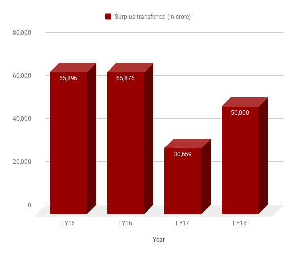 In FY18, the government was reportedly putting pressure on the RBI to give them an additional Rs Rs 13,000 crore, following which the RBI transferred Rs 10,000 crore as interim dividend in March this year. This was a part of Rs 50,000 crore surplus transfer announced for FY18.