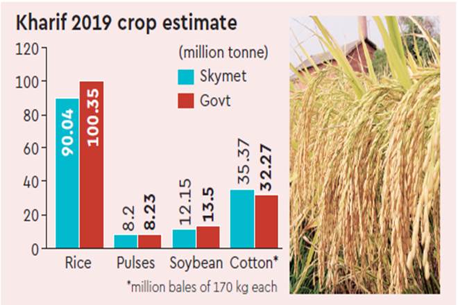 The Centre is also considering reducing the reserve price of rice by almost Rs 500/quintal under open market sale scheme (OMSS) of the FCI for bulk buyers due to poor offtake. Current reserve price is Rs 2,785/quintal. The plan was to sell around 2 million tonne rice from official reserves in 2019-20 Meanwhile, Skymet also said the cotton crop this year may surge to the highest level since 2013-14 thanks to a good weather in producing states of Gujarat and Maharashtra and also improved yields and overall increase in acreage. The cotton area rose 4% to 12.76 million hectare in 2019. The soybean and pulses output is expected to decline 12% and 4.5%, respectively year-on-year, the agency said. (see chart)
