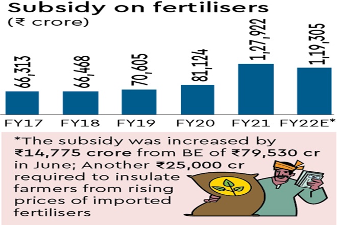 With this, the budgeted subsidy on fertiliers will be around Rs 1.19 lakh crore against the budget estimate (BE) of Rs 79,530 crore. On June 16, the Centre had announced a Rs 14,775-crore additional subsidy over and above the BE as it increased the subsidy on DAP by 140% for the kharif season to ensure that sowing of summer crops were unaffected by the surge in global prices of the fertiliser, which is largely imported.