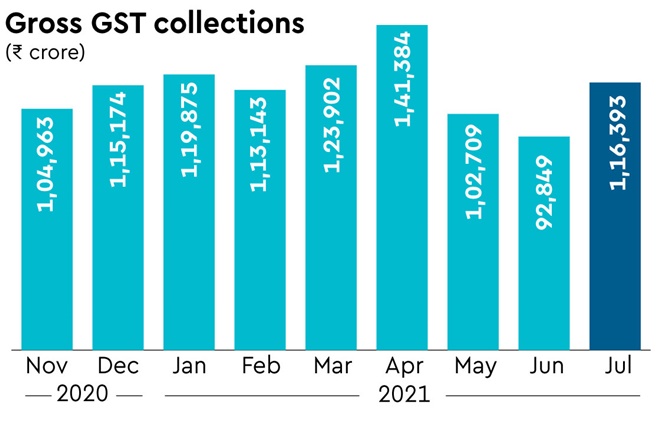 Gross goods and services tax (GST) collections came in at an impressive Rs 1.16 lakh crore in July (largely June transactions), up a third on year and a quarter on month, reflecting a smart economic recovery after the second Covid-19 wave. That in the first 25 days of July, the average daily e-way bill generation was 8.8% higher than the level in June and 54% higher than in May indicates the August collections (from July sales) could be even higher.