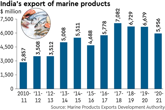 India exported 11.49 lakh tonne marine products worth Rs 43,717.26 crore ($5.96 billion) during FY21.In FY20, the shipment was 12.89 lakh tonne worth Rs 46,662.85 crore ($6.68 billion). US, China and the European Union (EU) were the leading importers, while frozen shrimp retained its position as the major export item followed by frozen fish.