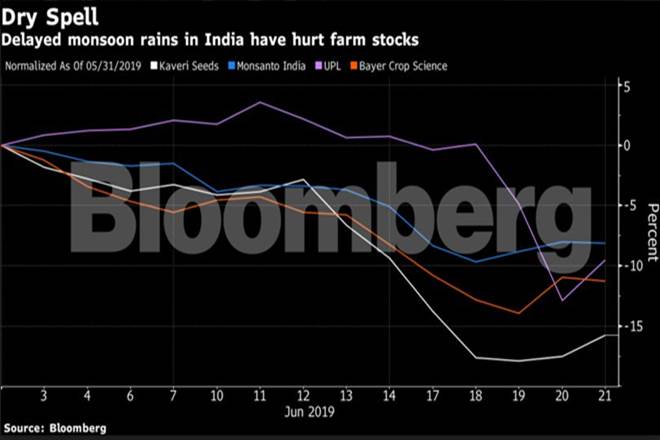 As monsoon rains that started late make a slow progress across India, shares of local seed producers, fertilizers and agro-chemical makers are reeling under a dark cloud.