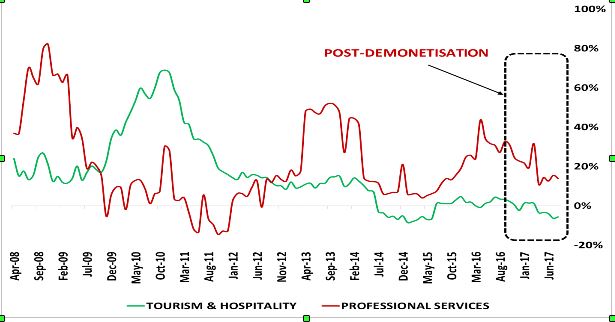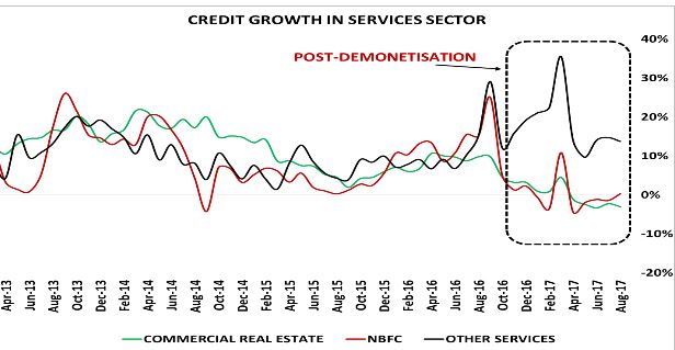 Credit off take of the services sector accounts for nearly 25% of the gross non-food credit. Within services sector, the major sub sectors are: tourism & hospitality, professional services, wholesale & retail trade, commercial real estate and other services. All of these time series have witnessed the jolt after demonetisation. However, almost all of them show little correlation with RBI’s cost of funds. India’s real estate had become bubble long back and part of the growth in NBFC lending was to this sector, through various means. A slowdown in lending to the real estate was inevitable.