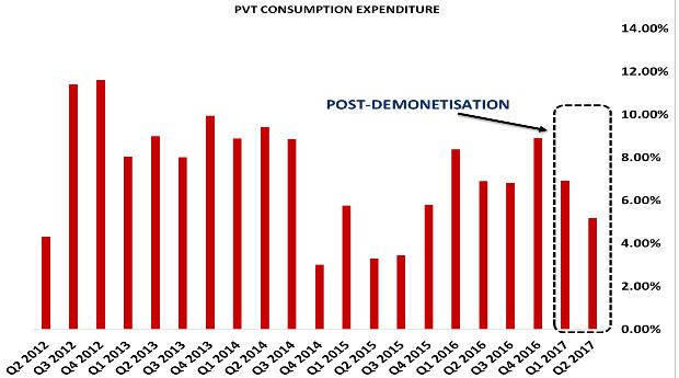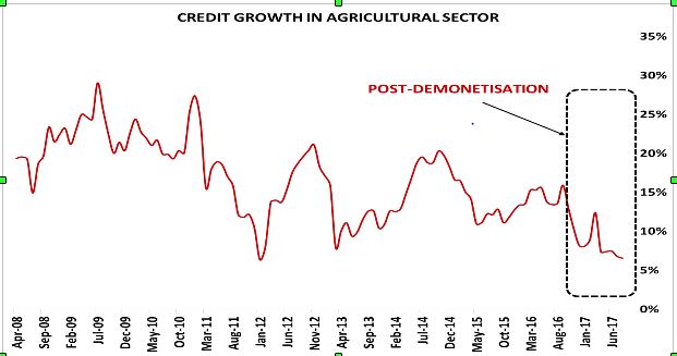 Finally, credit to agricultural sector, which is around 13% of gross banking credit being disbursed outside the priority sector. Credit growth used to be around 15% pre-demonetisation but after demonetisation it has decelerated on a month on month basis to 7%. Once again, intuitively one can understand that there factors apart from cost of money which affect the demand for credit from the sector. One of the factor which comes to mind, almost immediately, is seasonal rains or lack of inclement weather.