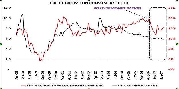 Now turn attention to consumer lending. Consumer credit’s share is little over 21%. It continues to log impressive growth of 15/16%. Pre-demonetisation this part of the economy was witnessing growth closer to 20%. There is a visible inverse correlation between cost of inter-bank lending and retail credit. Credit growth bottomed out in 2013, around 11/12%. As CoC tumbled in the inter-bank market, credit growth improved to nearly 20%. Common sense indicates there are more factors apart from cost of credit that positively drives retail credit growth. It can be factors viz,: employment growth, wage growth, credit penetration (in India, the shadow banking sector has done an excellent job of disbursing credit to many untouched and unbanked sectors. Even the Fintech sector is playing an active role), consumer expectation about future etc.