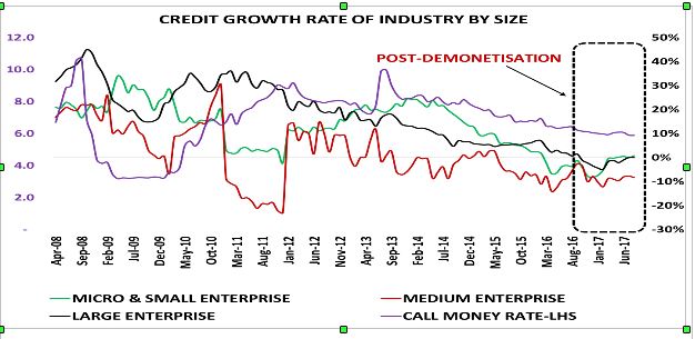 I will delve a bit deeper into the sectorial credit growth in India. Credit off take by micro, small, medium and large enterprise comprise ~40% of non-food credit. Credit growth of micro and small enterprises peaked around 24% y/y rate around January 2014, around the time, when effective rates in money market were peaking. Since then they have decelerated systematically to below 0. Credit to medium size enterprise too peaked by mid-2013 and since then have been on a downhill. Credit to large enterprises peaked by mid-2011 and since then have been on a downswing. All the three time series show a sharp deceleration post demonetisation. However, since January 2017, there has been a notable improvement in momentum in all three times series. Credit growth of small/micro enterprise and large enterprise have witnessed sharp improvement and now at or above zero line.