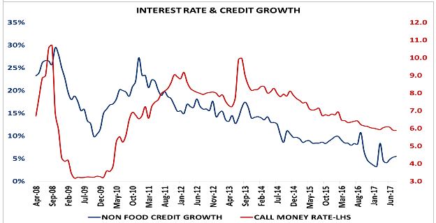 Since 2011, global economic growth slowed down and even consumption growth in India slowed. The slowdown in both these engines, coupled with investment slowdown caused capacity utilization to fall. Low capacity utilization and high credit spreads may be more responsible for low credit off take by the industrial sector, who account over 40% of the aggregate credit growth in India.