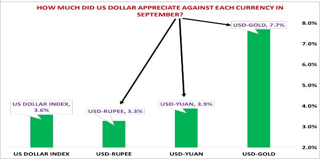 Over the month of September, it was not only the “experts” who panicked, even Rupee traders too panicked. USDINR which traded as low as 63.80 in early September, depreciated to nearly 66.00 levels. I believe it was significantly lopsided positioning which triggered an over-reaction. Long positions in Rupee was so bloated that the provocation from uptrend in USD in overseas market, coupled with fear of fiscal and monetary hara-kiri back home, triggered the sharp fall in Rupee against USD. However, the above chart shows how even during such a stress, Rupee performed better than its peers, a sign of a fundamentally strong currency.