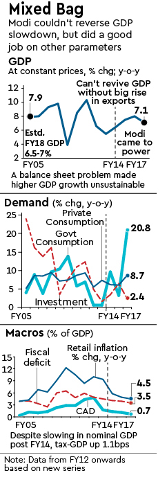 While most macros like inflation or the twin deficits improved under Modi, it goes beyond good luck with lower global inflation—by that logic, the go-go years of the UPA were surely influenced by high global growth. Exports growth that averaged 26.4% in FY05-08 played a big role in the average GDP growth of 9.1% — in FY14-17, exports contracted 3.8% on average. The role of RBI in keeping interest rates high—and thereby the rupee getting stronger—is also a big factor in sluggish GDP growth as it restricted local production and encouraged greater imports — Modi is guilty of accepting inflation-targeting (IT) that made RBI behave this way, but IT was pushed by the UPA.