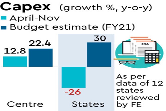 Against a 30% year-on-year jump projected for FY21, budgetary capital expenditure by state governments may have dropped by a quarter in April-November, going by an FE review of data from 12 states. Among them, these 12 states — Uttar Pradesh, Tamil Nadu, Madhya Pradesh, Andhra Pradesh, Karnataka, Rajasthan, Odisha, Telangana, Kerala, Chhattisgarh, Haryana and Jharkhand — reported combined capital expenditure of Rs 1,09,860 crore in April-November FY21, compared with Rs 1,48,571 crore in the year-ago period, down 26%. The annual capex target for all states as per their budgets is Rs 6.5 lakh crore.