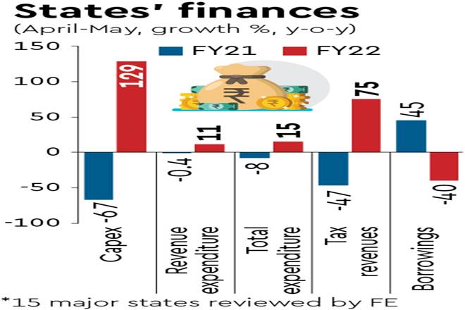 Tax revenues of the states reviewed were up 75% on year in April-May of FY22 at Rs 2.03 lakh crore, indicating impact of the second Covid-19 wave was much less than the year-ago period when there was a nationwide lockdown in place. The states saw their revenue expenditure rise 11% on year in April-May of FY22, while total expenditure rose 15%.