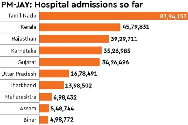On the other hand, only about 0.5 million people from Bihar got hospitalisation benefits under PM-JAY. Bihar has an average per capita income of just Rs 49,470, 80% lower than Tamil Nadu. Other states lagging in the use of the scheme include Assam (0.55 million), followed by Maharashtra (0.69 million) and Jharkhand (1.4 million). The dismal performance in Maharashtra is attributed by analysts to implementation issues. Launched on September 23, 2018, PM-JAY is the world’s largest insurance/assurance scheme. Currently, the scheme covers the bottom 40% population of the country, who are identified on the basis of select deprivation and occupational criteria in rural and urban areas, respectively, as per the socio-economic caste census (SECC) 2011.