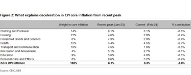 The headline CPI easing is no doubt good news but UBS says the current mix of strong real GDP growth and falling core inflation seems puzzling. According to them this could partly be explained as the impact of the lower global commodity prices helping in lessening the input cost pressure. That said, they believe that there is no urgency for the Reserve Bank’s MPC to change policy settings yet.