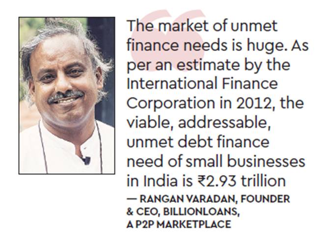 “The market of unmet finance needs is huge. As per an estimate by the International Finance Corporation in 2012, the viable, addressable, unmet debt finance need of small businesses in India is Rs 2.93 trillion (Rs 2.93 lakh crore),” says Rangan Varadan, founder and CEO of BillionLoans, a P2P marketplace.