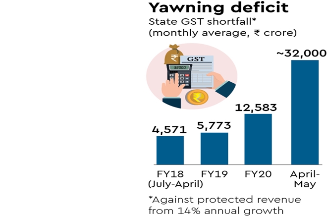 What has inflated the compensation requirement is a sharp fall in revenue in April-May due to the Covid lockdown: the gross GST collections shortfall during the two months was over 50%. Given that the monthly protected S-GST revenue under the compensation mechanism is Rs 63,700 crore for FY21, the shortfall in the state’s revenue in the first two months of this fiscal is roughly the same, if not slightly higher. Add another Rs 13,000 crore of unpaid S-GST compensation dues for March and the states’ claims for the March-May period approach the Rs 80,000-crore mark.