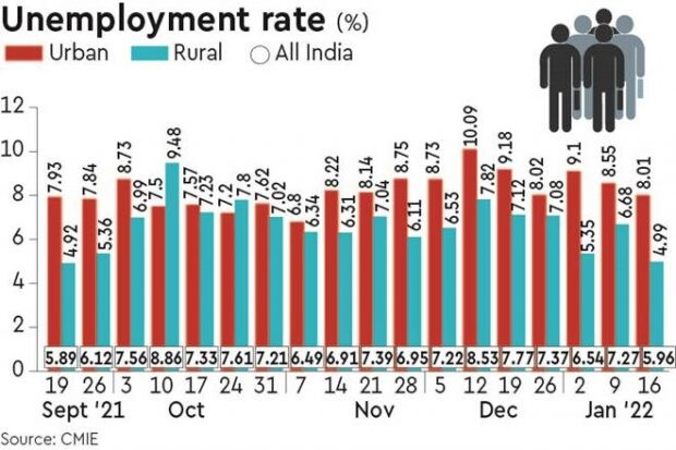 According to CMIE, the urban unemployment rate for the week ended January 16, 2022, was down to 8%, compared with 10% for the week ended on December 12. During the same time, the rural unemployment rate fell to 4.99% from 7.82%.