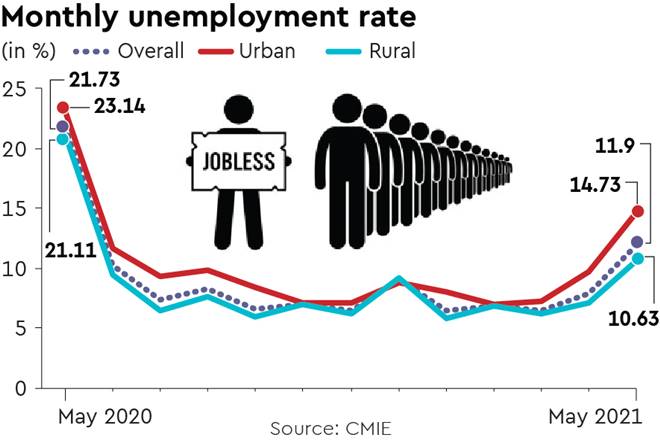According to CMIE, urban unemployment rate zoomed to 14.73% in May this year, the highest since 23.14% recorded in May last year. At 10.63%, rural joblessness in May was also the highest since 21.11% recorded in May last year.