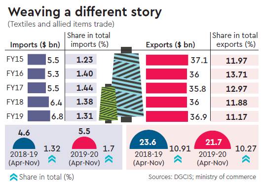 Textiles and garment imports, as percentage of such exports, surged from just about 13% in FY14 to a record 25% in the first eight months of this fiscal. Similarly, at 1.7%, the share of textiles and garments in the country’s overall imports in the April-November period was the highest in recent memory.