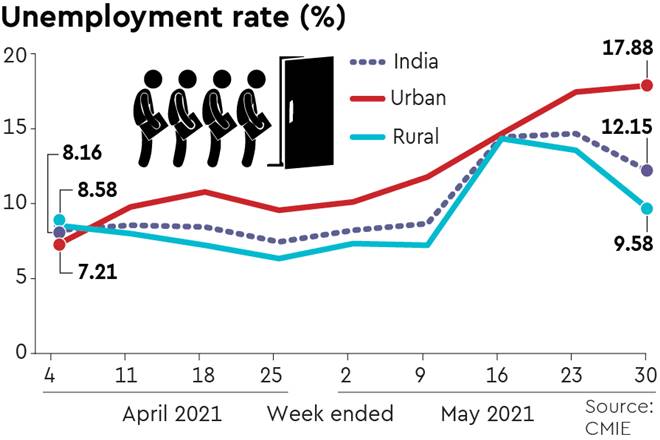 Unemployment in the urban areas stood at a worrisome 17.88% for the week ended May 30. The rate has risen for the seventh straight week and 47 basis points (bps) over the previous week. While worse is yet to come, the jury is still out on whether the rate will rise to the highest level ever of 27.1% seen in the aftermath of last year’s lockdown.