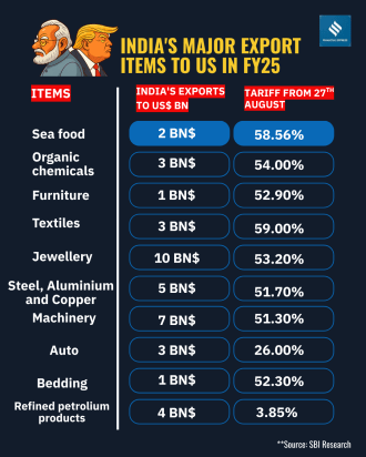 SBI research noted that India’s major export items to the United States — ranging from textiles and gems to seafood and chemicals and worth more than $48 billion — are under threat, as competing countries like China, Vietnam, Indonesia and Japan face significantly lower tariffs of 30 per cent, 20 per cent, 19 per cent and 15 per cent, respectively.