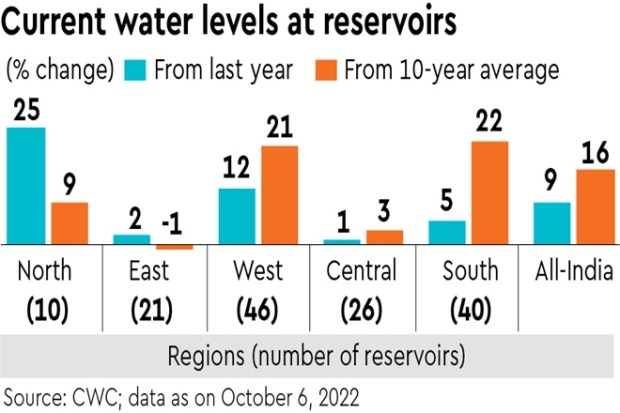 Water reservoirs are filled with 158 billion cubic metres (BCM) of water, 89% of their combined capacity. A year ago, the water available in the reservoirs was 146 BCM, and the average of the last 10 years was 136 BCM, according to the latest CWC note. “Current water level of reservoirs was 109% of the live storage of the corresponding period of last year and 116% of storage of the average of last 10 years,” the CWC stated.