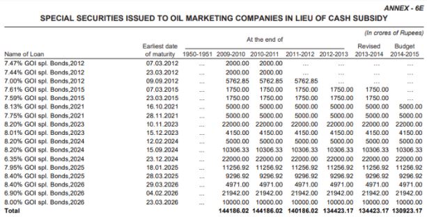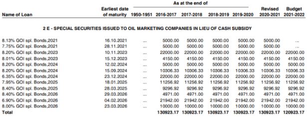 In the 2021-22 receipt budget, as per annexure 6E titled ‘Special Securities Issued to Oil Marketing Companies In Lieu Of Cash Subsidy’, pending liabilities related to oil bonds were Rs 1,30,923.17 crore. This means an amount of Rs 1,30,923.17 crore was the total value of pending oil bonds by the end of 2020-21.