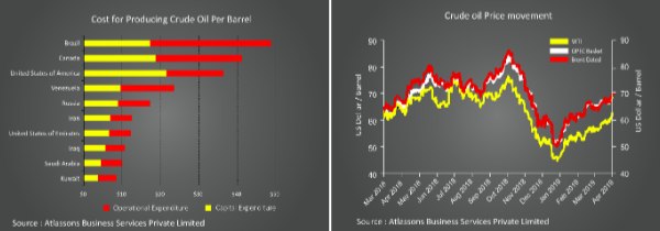 The bilateral trade between Indian and Mexico has witnessed an upswing and recorded in Jan-Dec 2018 $8.88 Billion out of which $3.578 Billion Crude oil has been imported and it is expected to go up further. Earlier this year Indian Oil Corp (IOC) signed its first annual contract with US suppliers and raised supplies from Mexico. However, distance between India and Origin country (crude oil exporter) is an important factor as this adds to the freight cost, taxes on crude oil and cost of production. If an available crude is traded at a discount to Brent crude with a difference of $3 to $5 a barrel and flexible payment terms (credit), it can make it very attractive. The graph shows and example of increasing the Cost of Crude oil and Crude oil price movement.