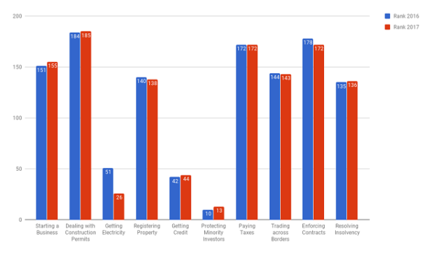 For each parameter, the World Bank provides a rank, which put together decide the overall ranking of India. In 2016, the World Bank Ease of Doing Business ranking 2017, India made a significant jump of 25 ranks in “getting electricity parameter”, mainly due to “electricity for all” programme launched by Narendra Modi, but fared poorly on many other fronts.