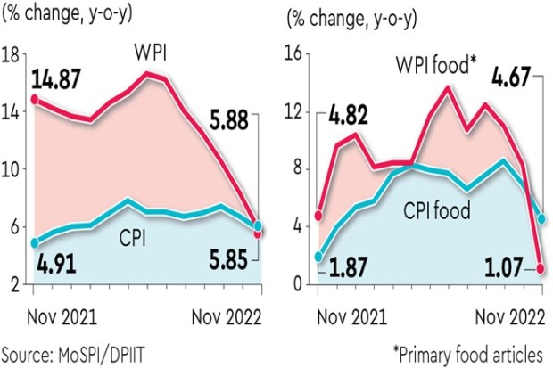 Wholesale price inflation hit a 21-month low of 5.85% in November, aided by a favourable base and a sharp drop in food inflation, further bolstering the notion that the price pressure in the economy has peaked.