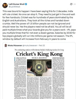 Modi was blunt about the shifting power dynamics, stating that India will rule the sport and other nations will eventually need to “get in line and wait for handouts.” He claimed that for a century, England and Australia controlled the riches and “handed down crumbs ” but the economic power of 1.5 billion people has now fundamentally rebalanced the books.