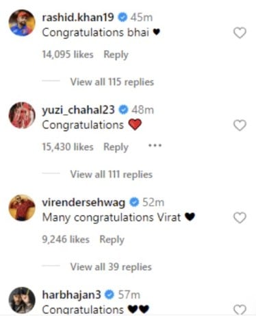 Virender Sehwag, Yuzvendra Chahal, Harbhajan Singh, Rashid Khan, and Varun Chakravarthy among others also extended their warm wishes to the happy couple.