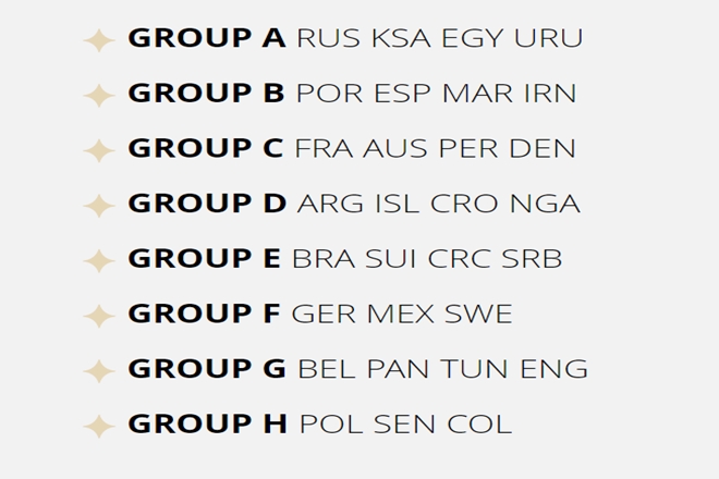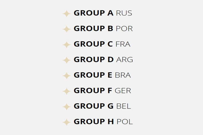 The four pots will be emptied by drawing the eight teams they each contain one by one and placing them in the eight groups of four teams (Groups A to H). Hosts Russia will occupy the top position in Group A, while the seven other seeds will occupy the top spots in Groups B to H. The positions of all the other teams (from pots 2, 3 and 4) will be decided when they are drawn.