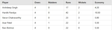 Arshdeep Singh was the pick of the bowlers for India, with two wickets for 17 runs from his four overs. Varun Chakravarthy (3/23) and Axar Patel (2/22) also played key roles in restricting England.