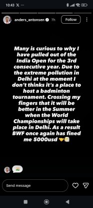 Uploading a story on his official Instagram handle and blaming Delhi’s pollution for his non-participation in the Indian Open for the last two seasons, Antonsen wrote, “Many is (are) curious [as] to why I have pulled out of the India Open for the 3rd consecutive year. Due to the extreme pollution in Delhi at the moment I don’t thinks (think) it’s a place to host a badminton tournament.”