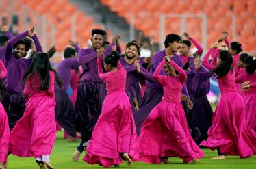 Artists rehearse on the eve of the ICC Men’s Cricket World Cup 2023’s final match between India and Australia, at the Narendra Modi Stadium, in Ahmedabad on Nov. 18. (Image: PTI)