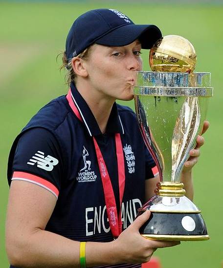 12: 13 AM: England captain Heather Knight celebrates with trophy after England won the ICC Women’s World Cup 2017 final match against India at Lord’s in London, England.