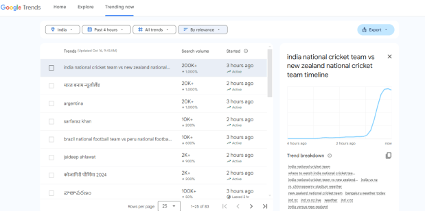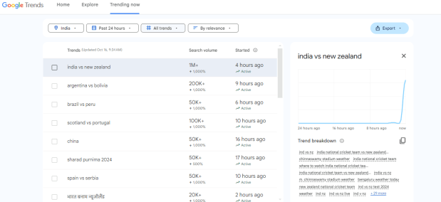 In the past day, there have been over one million search queries for the test match and today (Oct 16) there are over 200K+ search queries, maintaining India vs New Zealand as the top searched query on Google Trends for the second day.