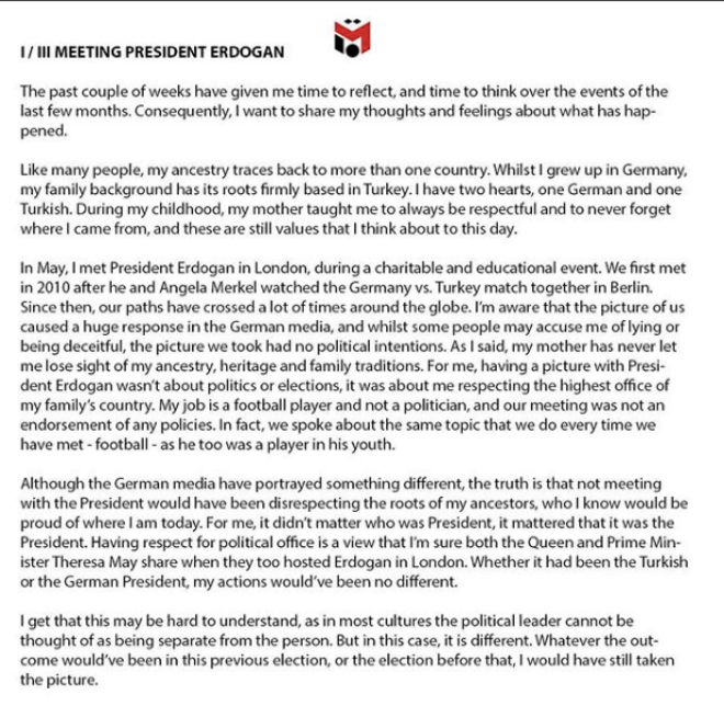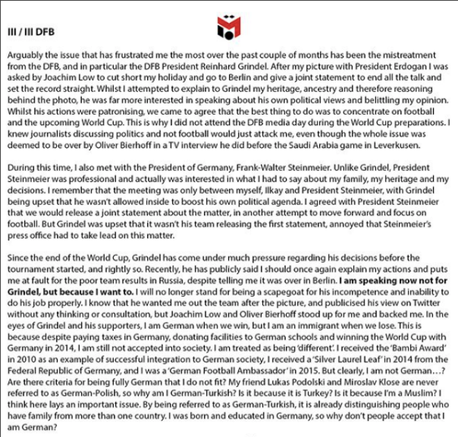 “This decision has been extremely difficult to make because I have always given everything for my teammates, the coaching staff and the good people of Germany. But when high-ranking officials of the DFB (the German football federation) treat me as they did, disrespect my Turkish roots and selfishly turn me into a political propaganda, then enough is enough, he added.