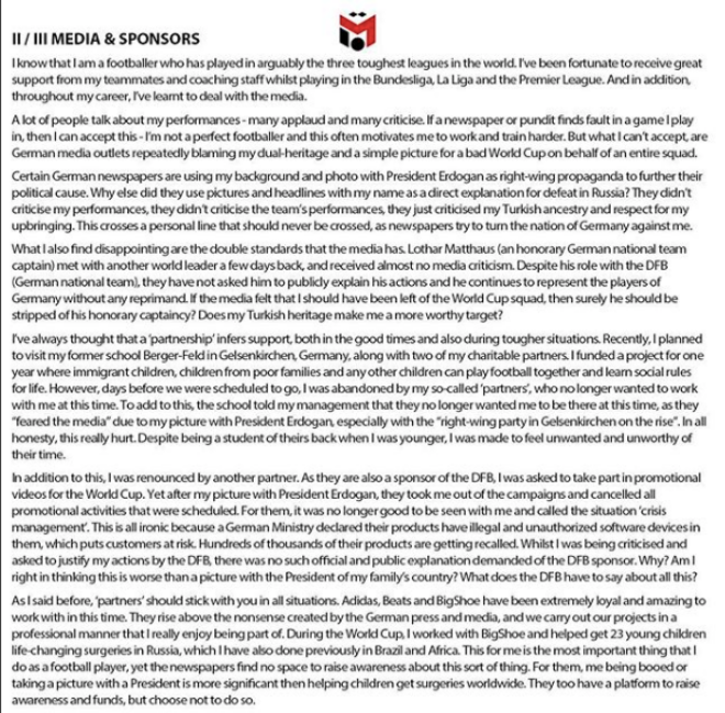 “This decision has been extremely difficult to make because I have always given everything for my teammates, the coaching staff and the good people of Germany. But when high-ranking officials of the DFB (the German football federation) treat me as they did, disrespect my Turkish roots and selfishly turn me into a political propaganda, then enough is enough, he added.