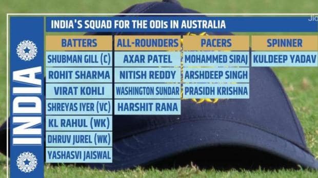 India’s ODI squad: Shubman Gill (Captain), Rohit Sharma, Virat Kohli, Shreyas Iyer (VC), Axar Patel, KL Rahul (WK), Nitish Kumar Reddy, Washington Sundar, Kuldeep Yadav, Harshit Rana, Mohammed Siraj, Arshdeep Singh, Prasidh Krishna, Dhruv Jurel (WK), Yashasvi Jaiswal
