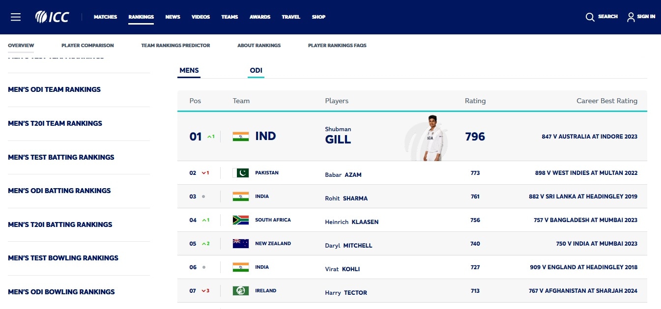 Gill’s rise to No. 1 is the result of his stellar performances in India’s recent 3-0 series victory against England. During the series, the 25-year-old scored two fifties and a century, with his match-winning 100 in Ahmedabad during the third ODI being a standout. With 796 rating points, Gill now leads Babar Azam, who holds 773 points.