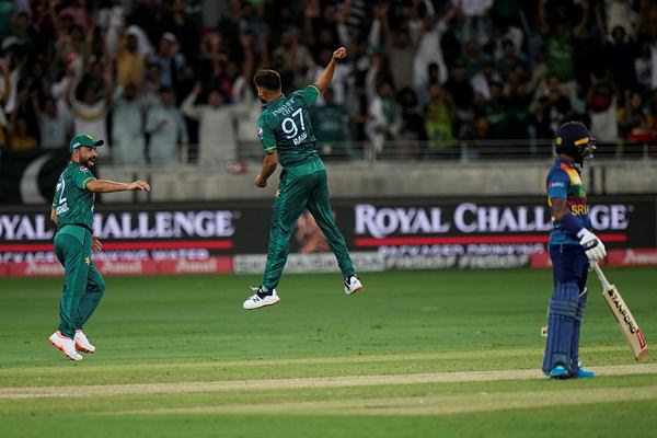 Pakistan's Haris Rauf, center, leaps to celebrate the dismissal of Sri Lanka's Danushka Gunathilaka during the T20 cricket match of Asia Cup between Pakistan and Sri Lanka, in Dubai, United Arab Emirates, Friday, Sept. 9, 2022. (AP Photo/Anjum Naveed)