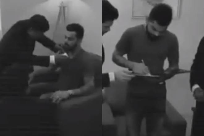 In this video which seems to be a CCTV footage, Virat Kohli can be seen sitting on the sofa with two men clicking pictures and hovering over his beard. After they are done clicking pictures of the cricketer from different profiles, they get him to write something, which seems like his sign, on paper.