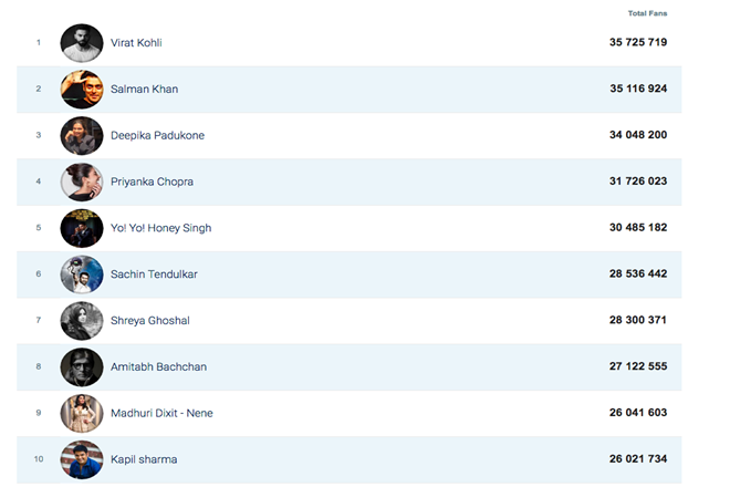 Kohli’s popularity is not just limited India but he is seen as an icon even in other countries. In Pakistan, Virat Kohli has over a million followers which is a big thing given the rivalry between the two nations. Among the global celebs, Virat Kohli is now at the 52nd spot. British band Coldplay tops the list with over 39 million followers, followed by Britney Spears and Justin Timberlake.
